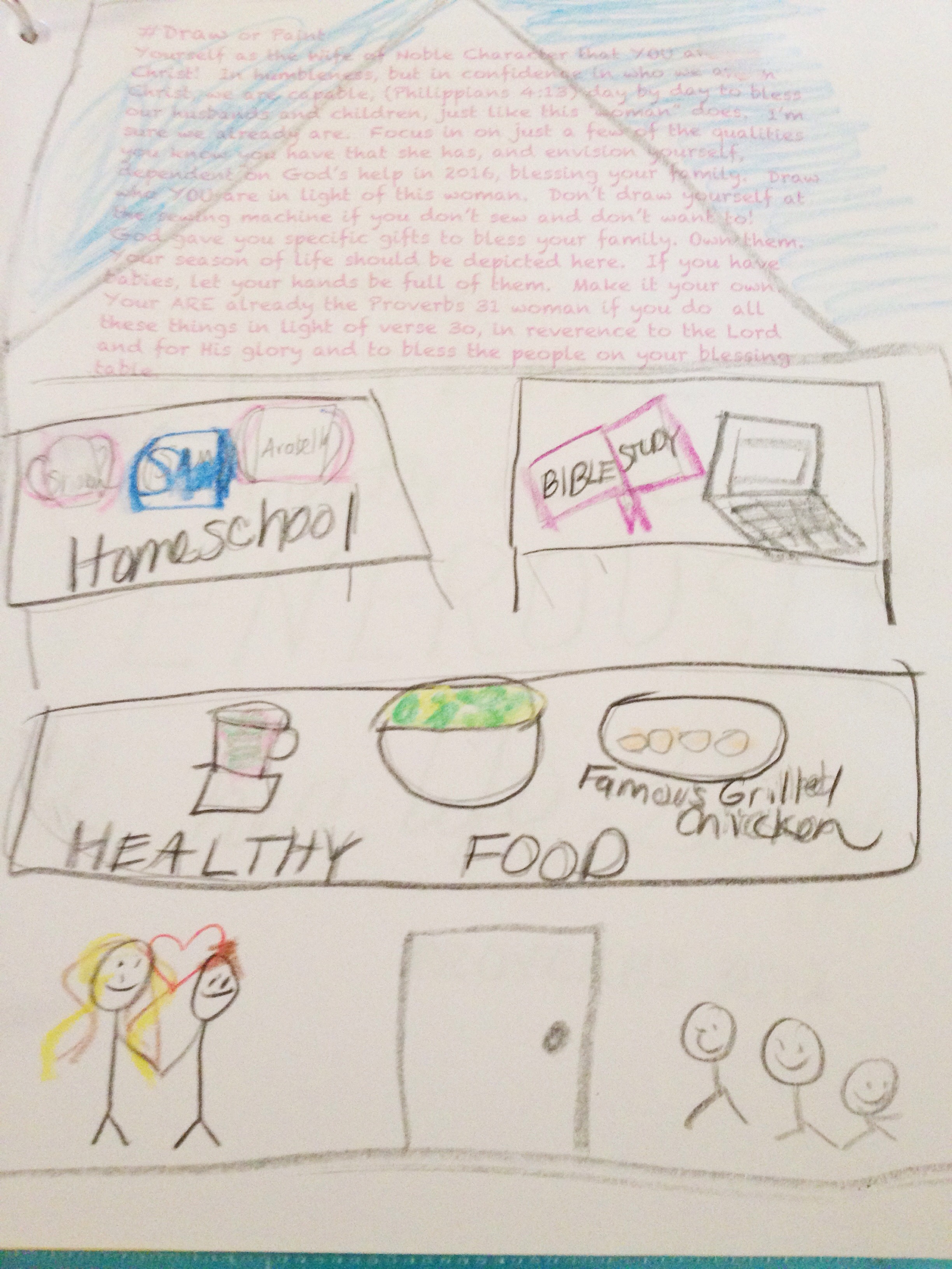 To further engage with the passage, you were asked to draw yourself as this virtuous woman, complete with all the gifts and talents you use to serve your family everyday. Here is my very quick sketch, depicting the most important tasks on my tables: